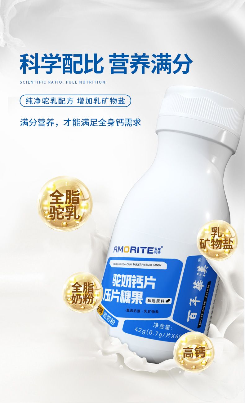 | 主要成分 | 全脂駱駝奶、山梨糖醇、乳擴(kuò)物鹽、全脂乳粉、硬脂酸鎂等。 |