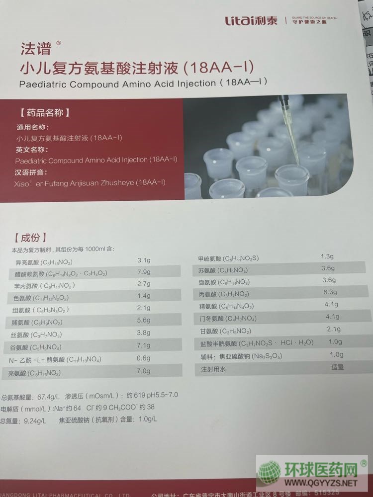 | 產(chǎn)品賣點(diǎn) | 小兒復(fù)方氨基酸注射液(18AA-Ⅰ) 100ml:6.74g(總氨基酸)*120瓶 甲類,不受限 廣東利泰制藥股份有限 |
