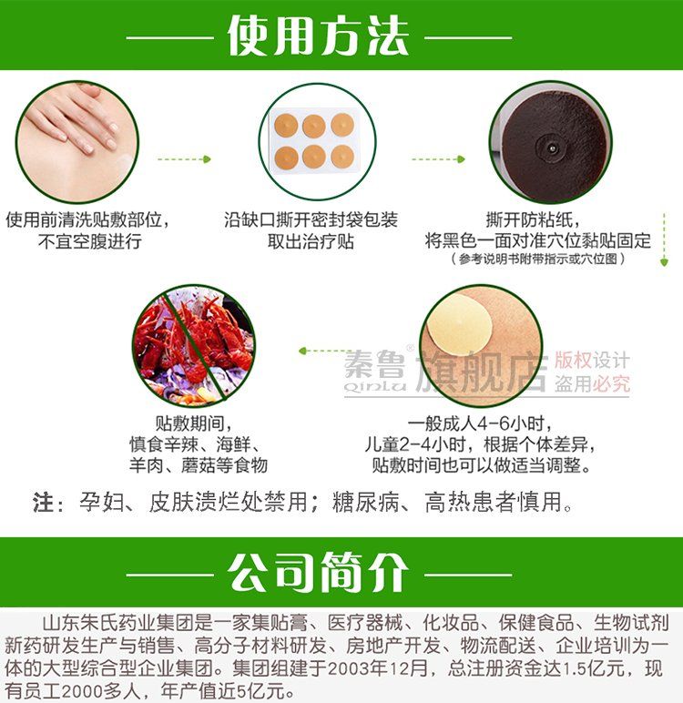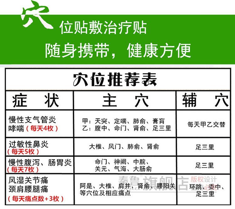 | 使用方法 | 清潔相應(yīng)穴位,確認(rèn)包裝無(wú)破損后,打開(kāi)包裝,取出穴位貼敷治療貼,將貼劑的隔離膜撕去,以鋼珠對(duì)準(zhǔn)相應(yīng)穴位敏感點(diǎn)貼壓,1片/穴、天。 |