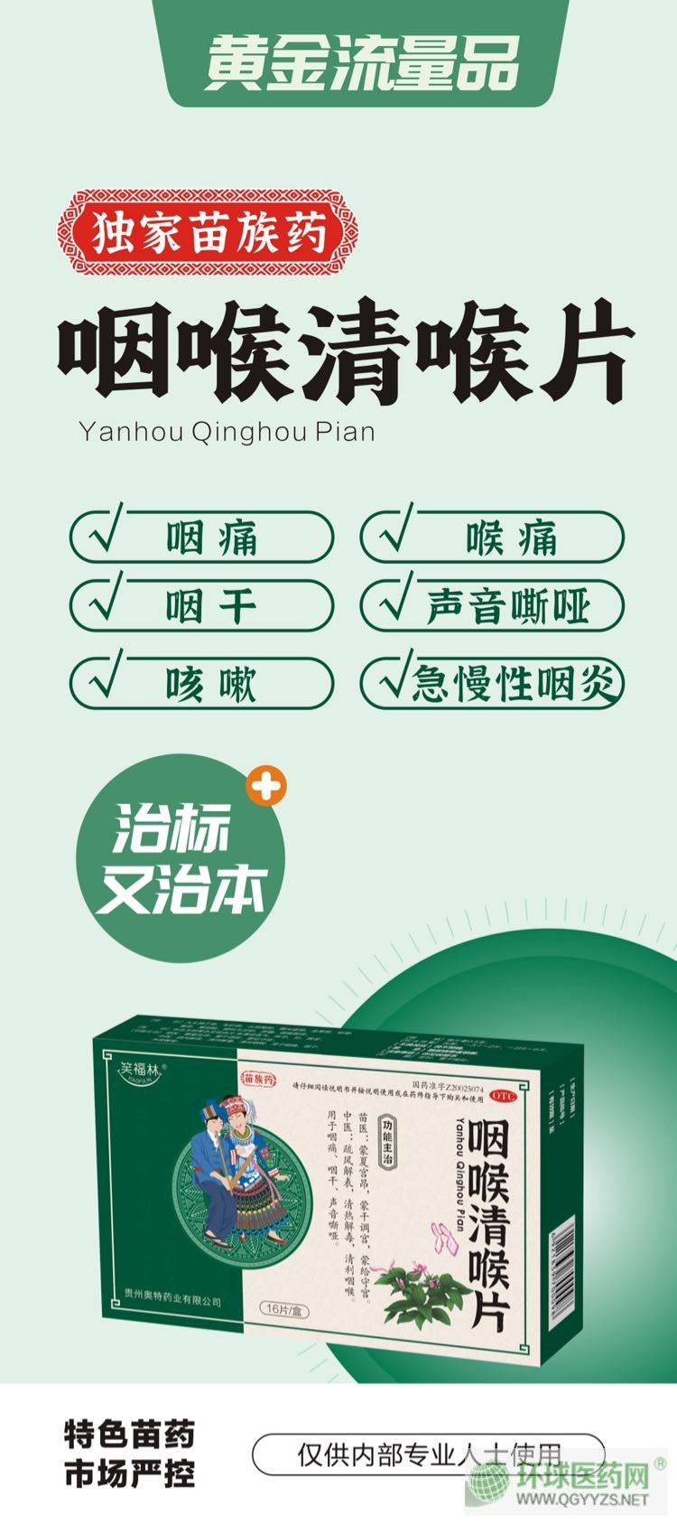| 產(chǎn)品賣(mài)點(diǎn) | 肆大功效:殺菌解毒止咳止痛 叁種人群:感冒咳嗽、咽痛咽炎、口臭 貳大優(yōu)勢(shì):平民價(jià)格名貴藥材獨(dú)家苗藥 壹大特色:含一片! |