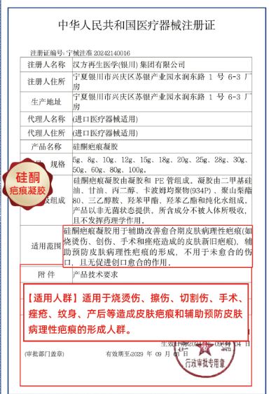 | 產(chǎn)品用途 | 適用于燒燙傷、擦傷、切割傷、手術(shù)、痤瘡、紋身、產(chǎn)后等造成皮膚疤痕和輔助預(yù)防皮膚病理性疤痕的形成人群輔助治療。 |