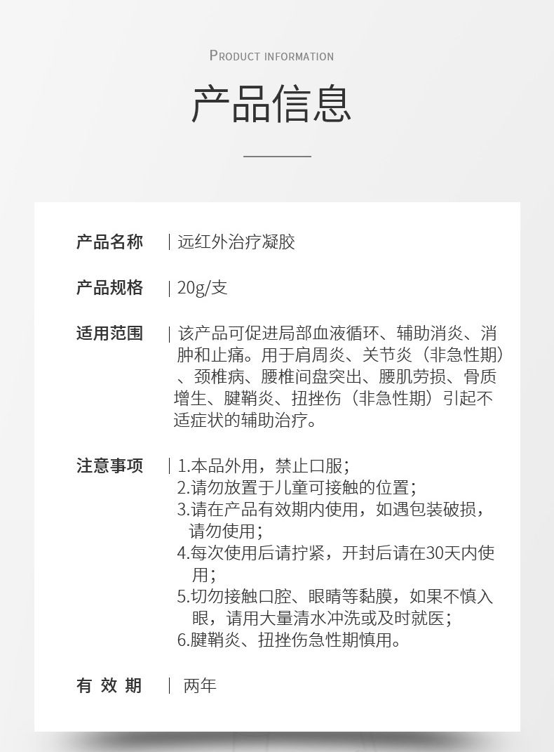 | 補充說明 | 遠紅外理療凝膠,以其特有的遠紅外線發(fā)射物質,通過涂抹在皮膚表面,深入滲透發(fā)揮作用。可緩解多種疼痛與炎癥,使用方便,**可靠,是輔助治療肌肉關節(jié)問題的良好選擇。但使用中需注意正確方法及避免接觸敏感部位。 |