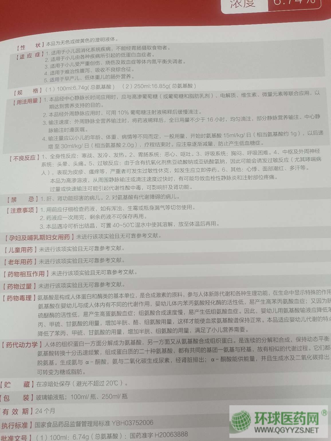 | 適應(yīng)癥 | 適用于小兒因消化系統(tǒng)疾病,不能經(jīng)胃腸攝取食物者。2、適用于小兒由**疾病所引起的低蛋白血癥者。3、適用于小兒受嚴(yán)重創(chuàng)傷、燒傷及敗血癥等體內(nèi)氮平衡失調(diào)者。4、適用于難治性腹瀉、吸收不良綜合征。5、適用于早產(chǎn)兒、低體重兒的腸外營養(yǎng)。 |