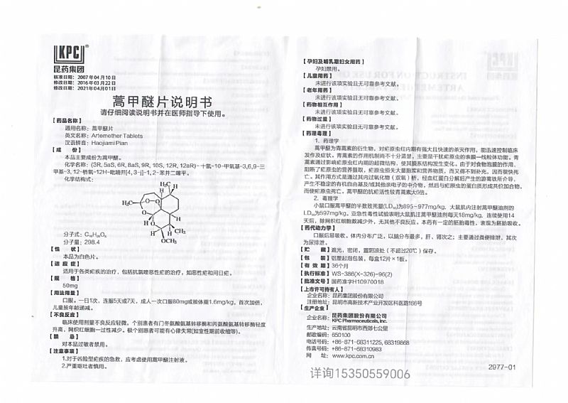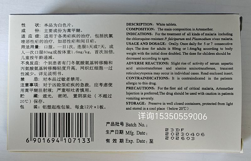 | 補(bǔ)充說明 | 成分 本品主要成份為蒿甲醚。 性狀 本品為白色片。 適應(yīng)癥 適用于各類瘧疾的治療,包括抗氯喹惡性瘧的治療,如惡性瘧和間日瘧。 規(guī)格 (1)40mg;(2)50mg。 用法用量 口服。一日1次,連服5天或7天,成人一次口服80mg或按體重1.6mg/kg,首次加倍,兒童按年齡遞減。 不良反應(yīng) 臨床使用劑量不良反應(yīng)輕微,個(gè)別患者有門冬氨酸氨基轉(zhuǎn)移酶和丙氨酸氨基轉(zhuǎn)移酶輕度升高,網(wǎng)織紅細(xì)胞一過性減少。極個(gè)別患者可能有心律失常(如室性期前收縮等)。 禁忌 對(duì)本品過敏者禁用。 注意事項(xiàng) 1、對(duì)于兇險(xiǎn)型瘧疾的急救,應(yīng)考慮使用蒿甲醚注射液。 2、嚴(yán)重嘔吐者慎用。 藥物相互作用 如與其他藥物同時(shí)使用可能會(huì)發(fā)生藥物相互作用,詳情請(qǐng)咨詢醫(yī)師或藥師。 藥理作用 蒿甲醚為青蒿素的衍生物,對(duì)瘧原蟲紅內(nèi)期有強(qiáng)大且快速的殺滅作用,能迅速控制臨床發(fā)作及癥狀。青蒿素的作用機(jī)制尚不十分清楚,主要是干擾瘧原蟲的表膜—線粒體功能。青蒿素通過影響瘧原蟲紅內(nèi)期的超微結(jié)構(gòu),使其膜系結(jié)構(gòu)發(fā)生變化。由于對(duì)食物泡膜的作用,阻斷了瘧原蟲的營養(yǎng)攝取,瘧原蟲損失大量胞漿和營養(yǎng)物質(zhì),而又得不到補(bǔ)充,因而很快死亡。其作用方式是通過其內(nèi)過氧化物(雙氧)橋,經(jīng)血紅蛋白分解后產(chǎn)生的游離鐵所介導(dǎo),產(chǎn)生不穩(wěn)定的有機(jī)自由基及/或其他親電子的中介物,然后與瘧原蟲的蛋白質(zhì)形成共價(jià)加合物,而使瘧原蟲死亡。蒿甲醚的抗瘧活性較青蒿素大6倍。 毒理作用 小鼠口服蒿甲醚的半數(shù)致死量(LD50)為895-977mg/kg,大鼠肌內(nèi)注射蒿甲醚油劑的LD50為597mg/kg。亞急性毒性試驗(yàn)表明大鼠肌注蒿甲醚油劑每天18mg/kg,連續(xù)使用14天后,除網(wǎng)織紅細(xì)胞數(shù)減少外,無其他不良反應(yīng)。本藥有一定的胚胎毒性,表現(xiàn)為胚胎吸收。 藥代動(dòng)力學(xué) 口服后易吸收。體內(nèi)分布廣泛,以腦分布*多,肝、腎次之;主要通過糞便排泄,其次為尿排泄。 貯藏方法 遮光,密封,在陰涼處(不超過20℃)保存。 有效期 36個(gè)月 執(zhí)行標(biāo)準(zhǔn) 國家食品藥品監(jiān)督管理局國家藥品標(biāo)準(zhǔn)WS1-(X-077)-2011Z。 鑒別 1、取本品細(xì)粉適量(約相當(dāng)于蒿甲醚20mg),加無水乙醇20ml使溶解,濾過,取濾液于水浴上揮去2/3溶劑后,取殘留液數(shù)滴點(diǎn)于白瓷板上,加1%香草醛-硫酸溶液1滴,即顯桃紅色。 2、取本品細(xì)粉適量(約相當(dāng)于蒿甲醚100mg),置10ml量瓶中,加氯仿適量,振搖,使篙甲醚溶解并稀釋至刻度,搖勻,濾過,棄去初濾液,取續(xù)濾液作為供試品溶液;另取蒿甲醚對(duì)照品適量,加氯仿制成每1ml含蒿甲醚對(duì)照品10mg的溶液作為對(duì)照品溶液。照薄層色譜法(中國藥典1995年版二部附錄ⅤB)試驗(yàn),分別吸取上述兩種溶液各10μl,點(diǎn)于同一硅膠G板上。以石油醚(30-60℃)-醋酸乙酯(7∶3)為展開劑,展開后,取出晾干,在碘蒸氣中顯色,供試品溶液與對(duì)照品溶液應(yīng)在相同的位置上顯相同的黃色斑點(diǎn)。 3、取本品細(xì)粉適量(約相當(dāng)于蒿甲醚50mg),加無水乙醇30ml使溶解,濾過,揮干溶劑,取殘?jiān)迷嚬苤校颖姿?ml,苯酚少許,氫碘酸3ml及沸石數(shù)粒,管口用裝有砷鹽檢測(cè)法所用帶玻璃管的橡皮塞密塞,玻璃管中裝有醋酸鉛棉花[取醋酸鉛1g,加水10ml使溶解,此液加入到60ml的1mol/L氫氧化鈉溶液中,不斷攪拌,直至沉淀完全溶解,再加甘油1ml,加水至100ml,搖勻,將棉花浸入此溶液后,取出,烘干,即得],長約2cm,在兩塊圓形平板中央夾入一塊用硝酸汞溶液[取水49ml,加硝酸1ml,再加硝酸汞制成飽和溶液]潤濕過的濾紙,將裝好的試管置130-140℃的油浴中,加熱5-10分鐘,濾紙應(yīng)呈朱紅色或橙紅色斑點(diǎn)。 檢查 1、溶出度:取本品,照溶出度測(cè)定法(中國藥典1995年版二部附錄ⅩC第二法),以水1000ml為溶劑,轉(zhuǎn)速為每分鐘100轉(zhuǎn),依法操作,經(jīng)60分鐘時(shí),取溶液10ml,濾過,棄去初濾液,精密量取續(xù)濾液5ml于25ml量瓶中,加鹽酸無水乙醇液(1.00±0.01mol/L)[取鹽酸90ml,加無水乙醇至1000ml,搖勻,用氫氧化鈉滴定液(1mol/L)標(biāo)定此鹽酸無水乙醇液的濃度,再調(diào)整為1.00±0.01mol/L]稀釋至刻度,搖勻,密塞,于55±1℃恒溫水浴中保溫5小時(shí)(整個(gè)量瓶刻度以下都應(yīng)處于保溫環(huán)境中),取出,放冷至室溫,照分光光度法(中國藥典1995年版二部附錄ⅣA)在254nm波長處測(cè)定吸收度,按C16H26O5的吸收系數(shù)(E1m)為379計(jì)算每片的溶出量,限度為標(biāo)示量的65%,應(yīng)符合規(guī)定。 2、其他:應(yīng)符合片劑項(xiàng)下有關(guān)的各項(xiàng)規(guī)定(中國藥典1995年版二部附錄ⅠA)。 含量測(cè)定 取本品10片,精密稱定,研細(xì),精密稱取適量(約相當(dāng)于蒿甲醚13mg),置100ml量瓶中,加無水乙醇溶解并稀釋至刻度,振搖15分鐘,濾過,棄去初濾液,精密量取續(xù)濾液5ml,置50ml量瓶中,加鹽酸無水乙醇液(1.00±0.01mol/L)稀釋至刻度,搖勻,密塞,于55±1℃恒溫水浴中保溫5小時(shí)(整個(gè)量瓶刻度以下都應(yīng)處于保溫環(huán)境中),取出,放冷至室溫,照分光光度法(中國藥典1995年版二部附錄ⅣA)在254nm波長處測(cè)定吸收度,按C16H26O5的吸收系數(