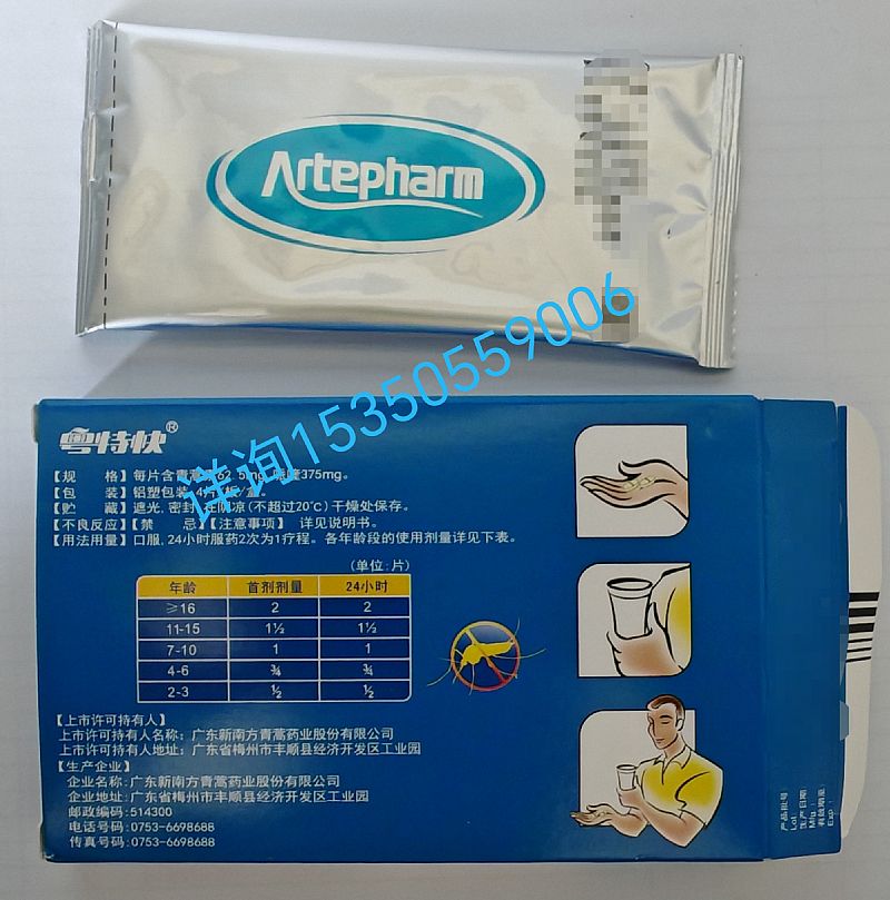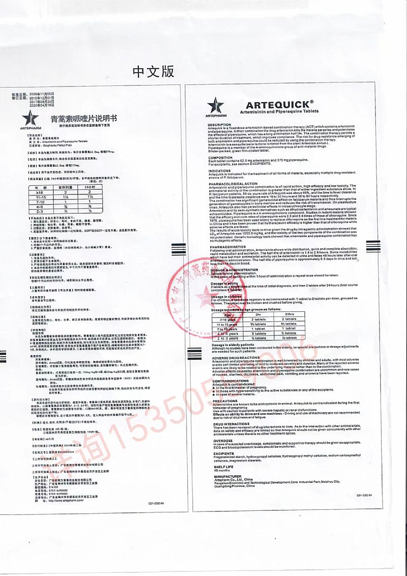 | 主要成分 | 本品為復(fù)方制劑,其組份為:每片含青蒿素62.5mg,哌喹375mg。 |