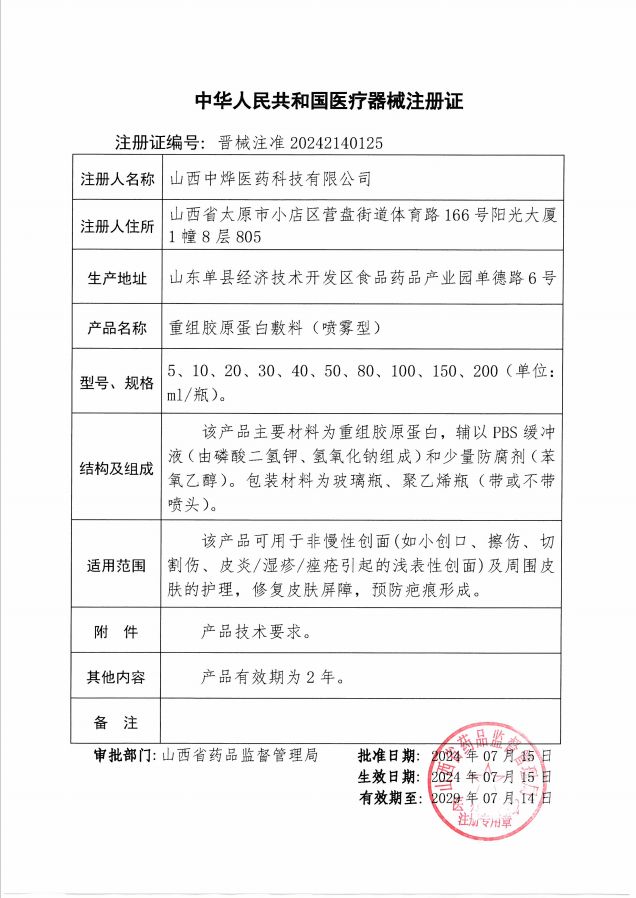 | 產(chǎn)品名稱 | 重組膠原蛋白敷料(噴霧型) |