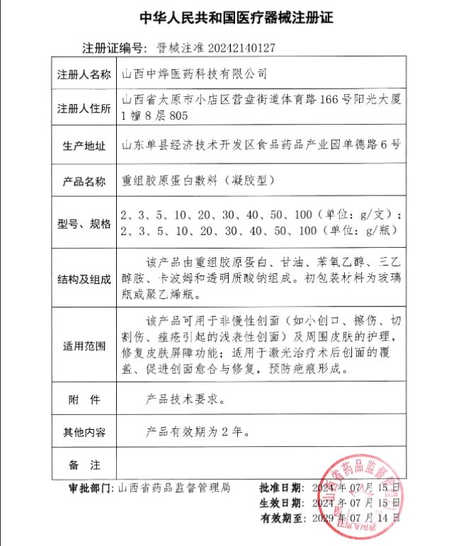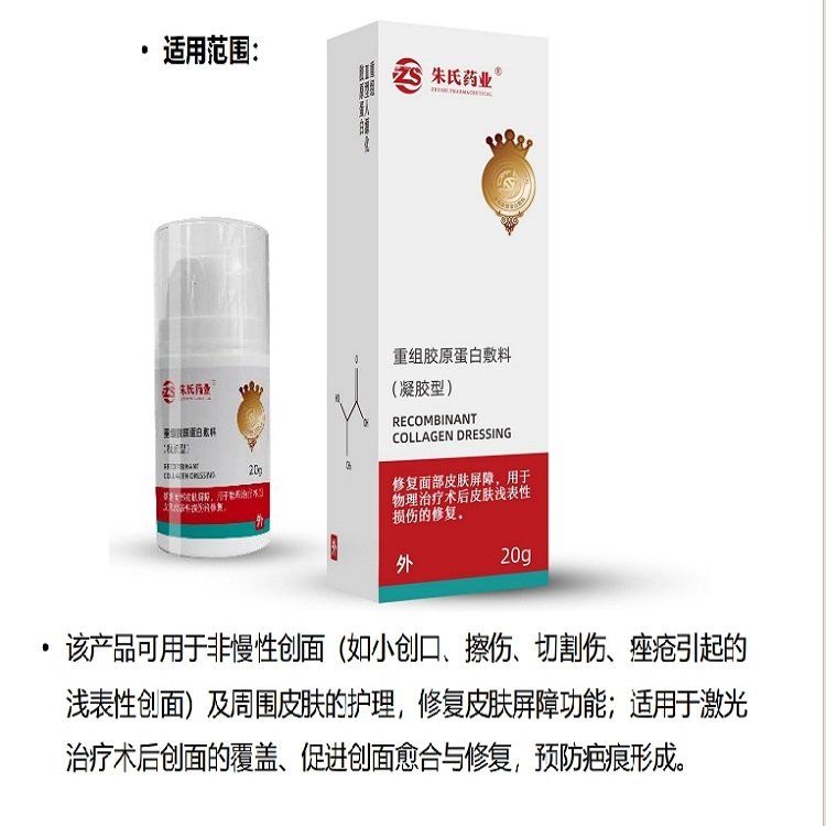 | 補充說明 | 重組膠原蛋白敷料(凝膠型) 結構及組成: 該產品由重組膠原蛋白、甘油、苯氧乙醇、三乙醇胺、卡波姆和透明質酸鈉組成。初包裝材料為玻璃瓶或聚乙烯瓶。 適用范圍: 該產品可用于非慢性創(chuàng)面(如小創(chuàng)口、擦傷、切割傷、痤瘡引起的淺表性創(chuàng)面)及周圍皮膚的護理,修復皮膚屏障功能;適用于激光治療術后創(chuàng)面的覆蓋、促進創(chuàng)面愈合與修復,預防疤痕形成。 |
