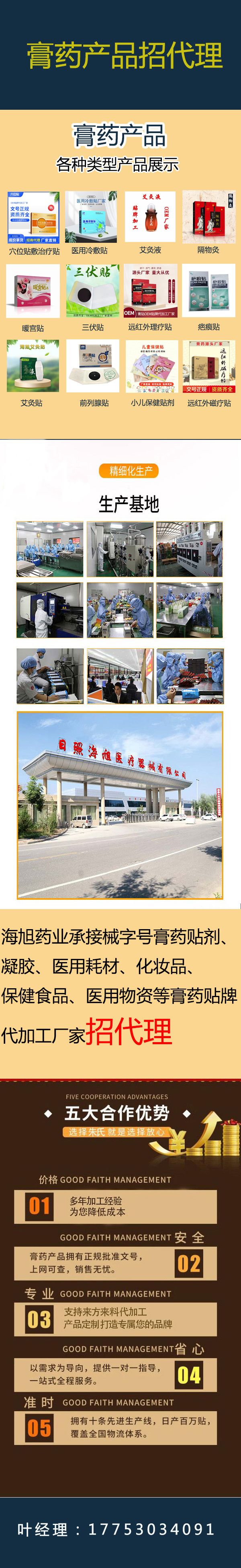 - 海旭醫(yī)療主要承接各類暖宮貼定制、遠(yuǎn)紅外理療貼代加工、磁療貼貼牌加工、穴位敷貼廠家、灸熱貼代加工、退熱貼代加工、燙熨治療包定制、小兒咳 喘腹瀉膏藥定制加工、艾灸貼定制、化妝品定制、保健食品定制、噴劑、乳膏類加 工等醫(yī)院臨床和終端診所所需的系列產(chǎn)品。公司的經(jīng)營范圍有:骨科,婦科、男科、手術(shù)科、五官科和小兒科等。