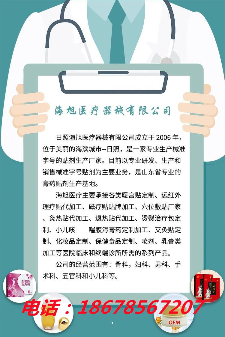 - 海旭醫(yī)療主要承接各類暖宮貼定制、遠(yuǎn)紅外理療貼代加工、磁療貼貼牌加工、穴位敷貼廠家、灸熱貼代加工、退熱貼代加工、燙熨治療包定制、小兒咳 喘腹瀉膏藥定制加工、艾灸貼定制、化妝品定制、保健食品定制、噴劑、乳膏類加 工等醫(yī)院臨床和終端診所所需的系列產(chǎn)品。公司的經(jīng)營范圍有:骨科,婦科、男科、手術(shù)科、五官科和小兒科等。