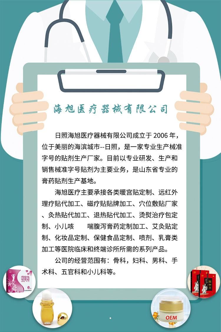 - 海旭醫(yī)療主要承接各類暖宮貼定制、遠(yuǎn)紅外理療貼代加工、磁療貼貼牌加工、穴位敷貼廠家、灸熱貼代加工、退熱貼代加工、燙熨治療包定制、小兒咳 喘腹瀉膏藥定制加工、艾灸貼定制、化妝品定制、保健食品定制、噴劑、乳膏類加 工等醫(yī)院臨床和終端診所所需的系列產(chǎn)品。公司的經(jīng)營(yíng)范圍有:骨科,婦科、男科、手術(shù)科、五官科和小兒科等。
