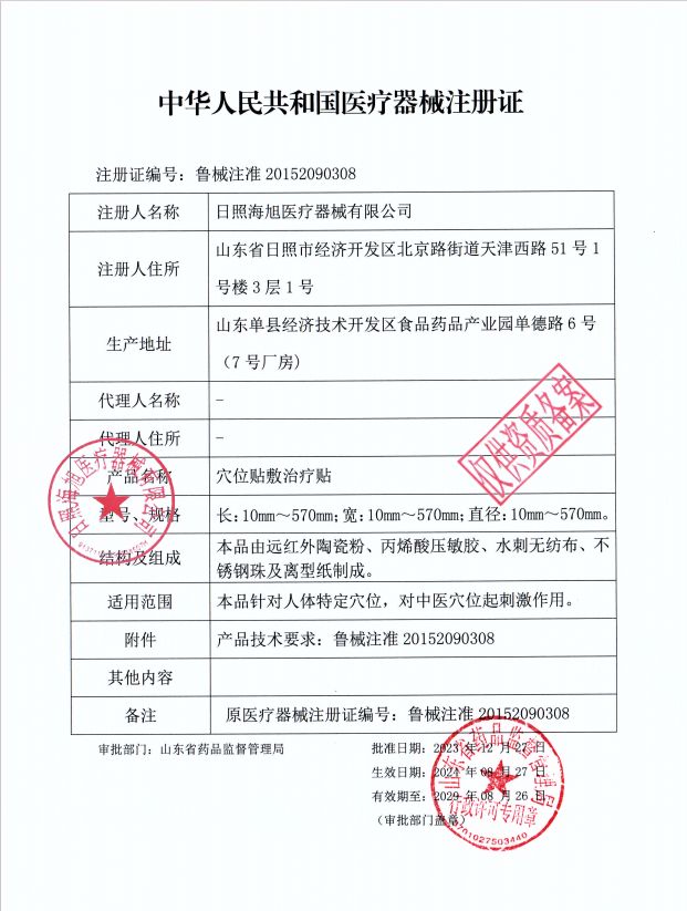 | 補(bǔ)充說明 | 【規(guī) 格】直徑25mm、30mm×30mm、40mm×60mm、50mm×50mm、50mm×70mm、50mm×80mm、60mm×70mm、60mm×90mm、70mm×70mm、70mm×100mm、85mm×85mm、95mm×130mm 【結(jié)構(gòu)性能】本品由遠(yuǎn)紅外陶瓷粉、丙烯酸壓敏膠、水刺無紡布、不銹鋼珠及離型紙制成。穴位貼敷治療貼的壓敏膠布剝離強(qiáng)度不小于1.0N/cm,持粘性應(yīng)不大于2.5mm,遠(yuǎn)紅外發(fā)射波長(zhǎng)范圍8μm-15μm,法向比輻射率≥75%。 【適用范圍】本品針對(duì)人體特定穴位,對(duì)中醫(yī)穴位起刺激作用。 【注意事項(xiàng)】1、**一次性使用,用后銷毀; 2、叮囑患者定時(shí)按壓,按壓不能過度用力,以不損傷皮膚為宜; 3、無粘性、包裝破損或過有效期禁止使用; 4、夏季多汗,宜勤換; 5、敷貼后如有過敏等不適,應(yīng)停止敷貼。 【慎用】糖尿病、高熱患者。 【禁忌癥】孕婦、皮膚潰爛處禁用。 |