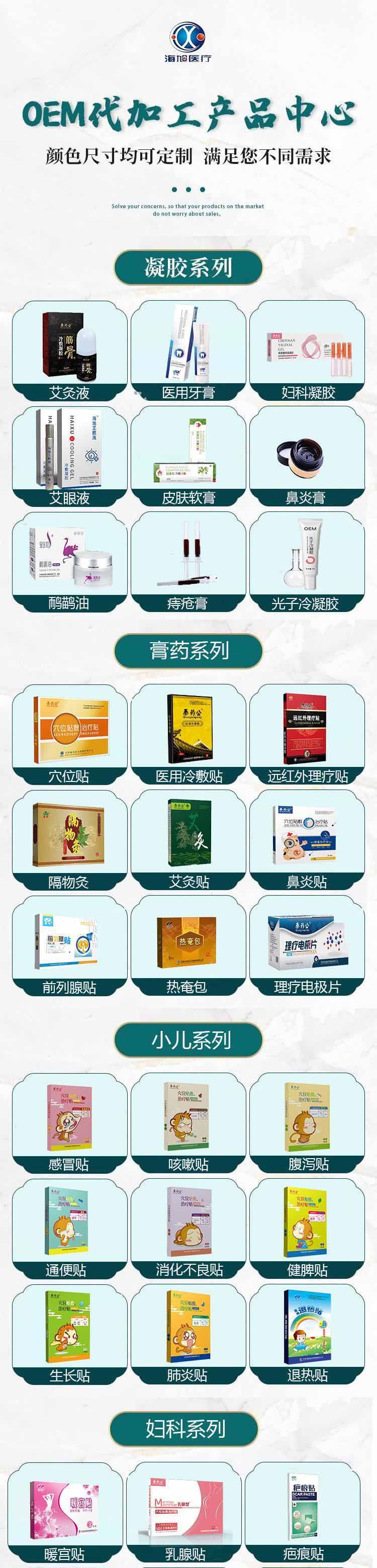 - 海旭醫(yī)療主要承接各類暖宮貼定制、遠(yuǎn)紅外理療貼代加工、磁療貼貼牌加工、穴位敷貼廠家、灸熱貼代加工、退熱貼代加工、燙熨治療包定制、小兒咳 喘腹瀉膏藥定制加工、艾灸貼定制、化妝品定制、保健食品定制、噴劑、乳膏類加 工等醫(yī)院臨床和終端診所所需的系列產(chǎn)品。公司的經(jīng)營(yíng)范圍有:骨科,婦科、男科、手術(shù)科、五官科和小兒科等。