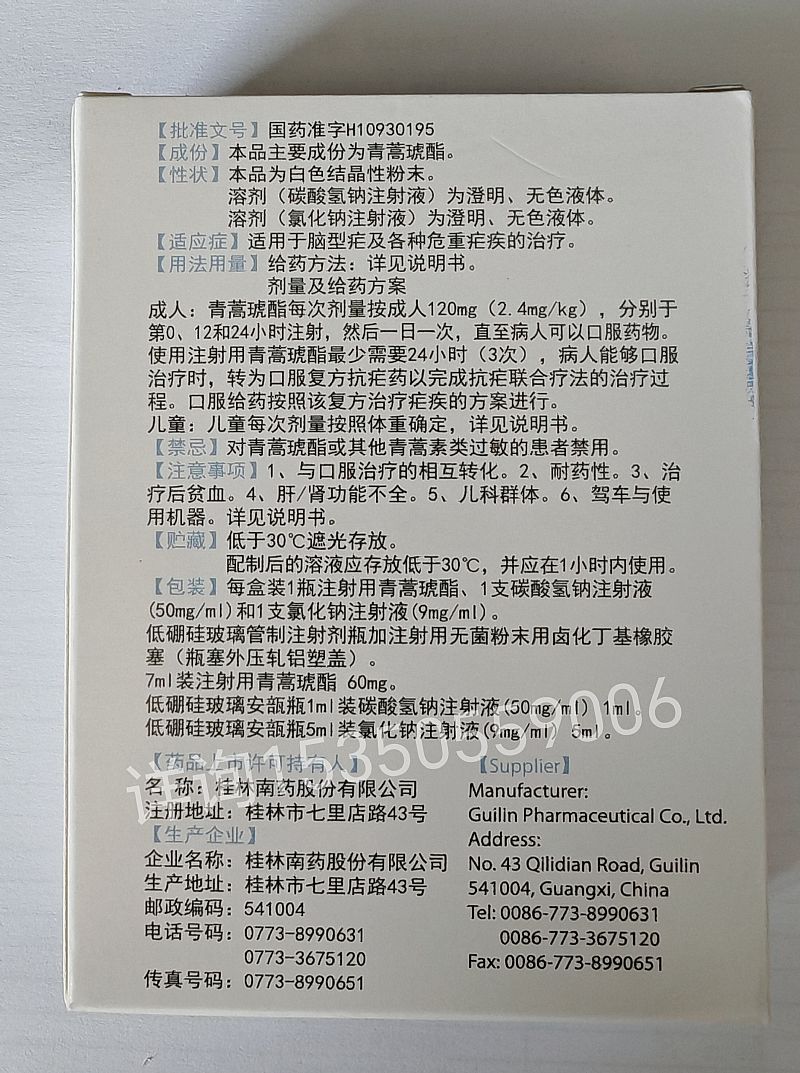 | 注意事項 | 1、本品溶解后應(yīng)及時注射,如出現(xiàn)混濁不可使用; 2、極度嚴(yán)重患者,首次劑量可加倍; 3、瘧狀控制后,宜再用其他抗瘧藥根治; 4、靜脈注射速度不宜太快,每分鐘3~4mL。 |