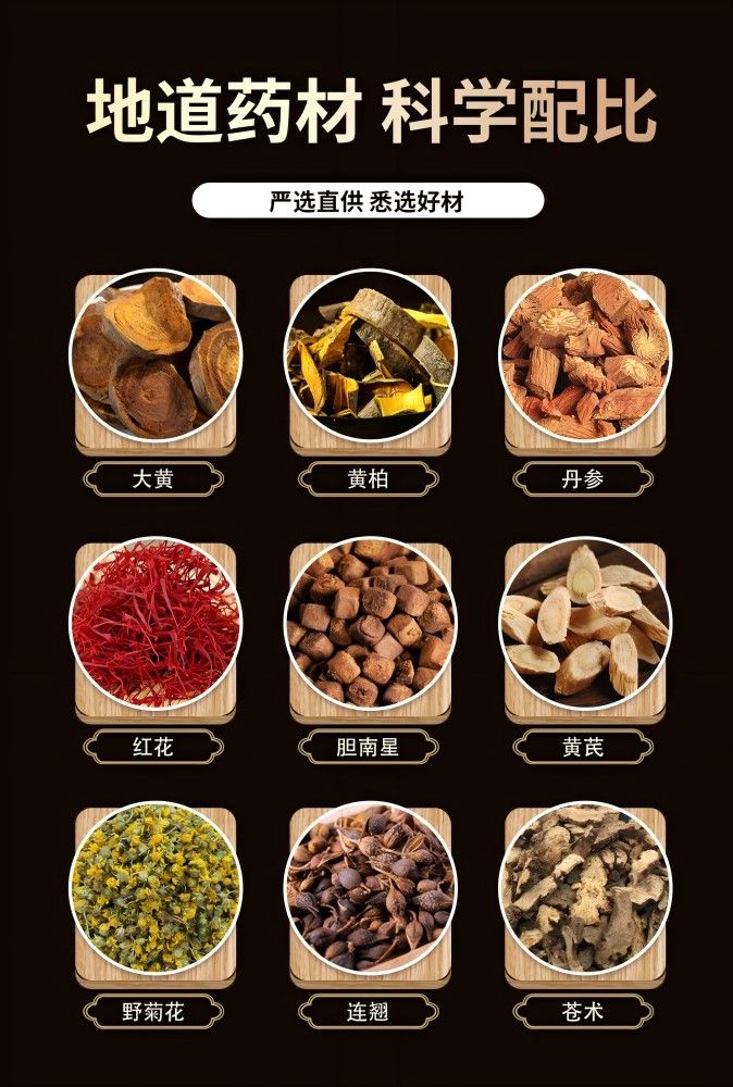 | 主要成分 | 本品由大黃、黃柏、丹參、紅花、膽南星、黃芪、野菊花、連、冰片等組成。 |