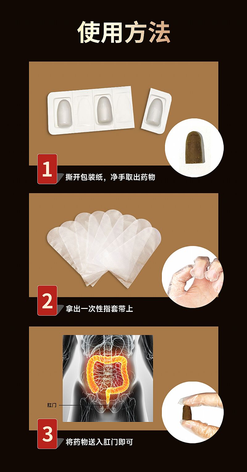 | 用法用量 | 【使用方法】用戴套的手指將本品納入肛中4.6厘米處,一日1-2次,每次1粒。 |