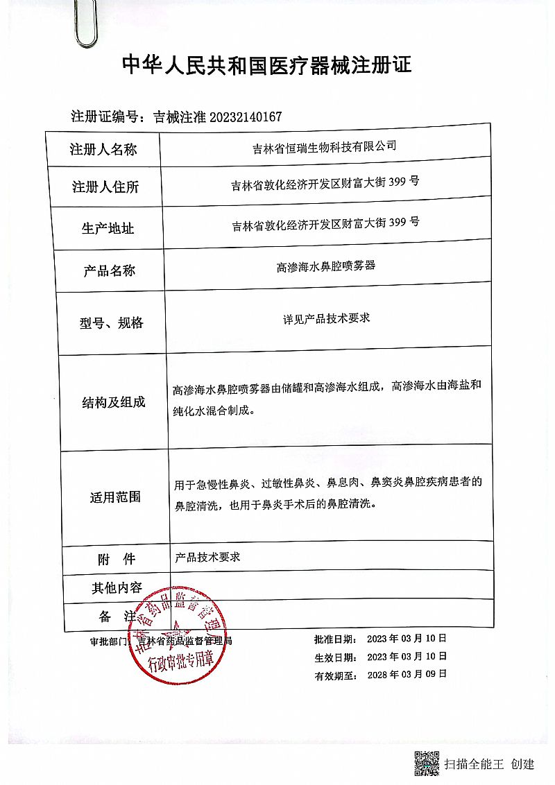 | 主要成分 | 高滲海水鼻腔噴霧器由儲(chǔ)罐和高滲海水組成,高滲海水由海鹽和純化水混合制成。 |