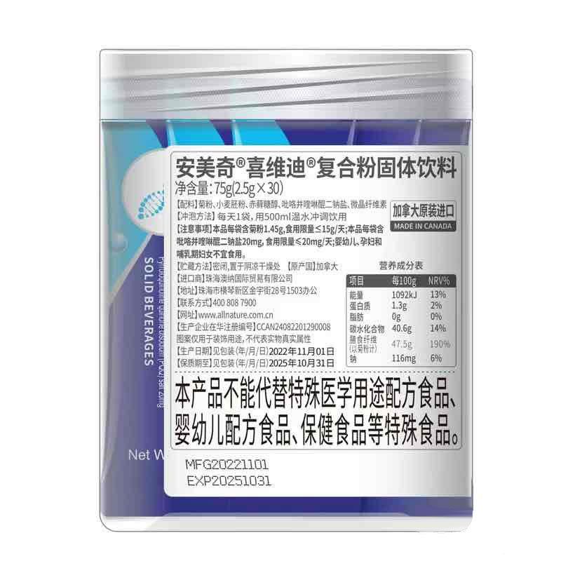 | 產(chǎn)品名稱(chēng) | 安美奇喜維迪復(fù)合粉固體飲料 |