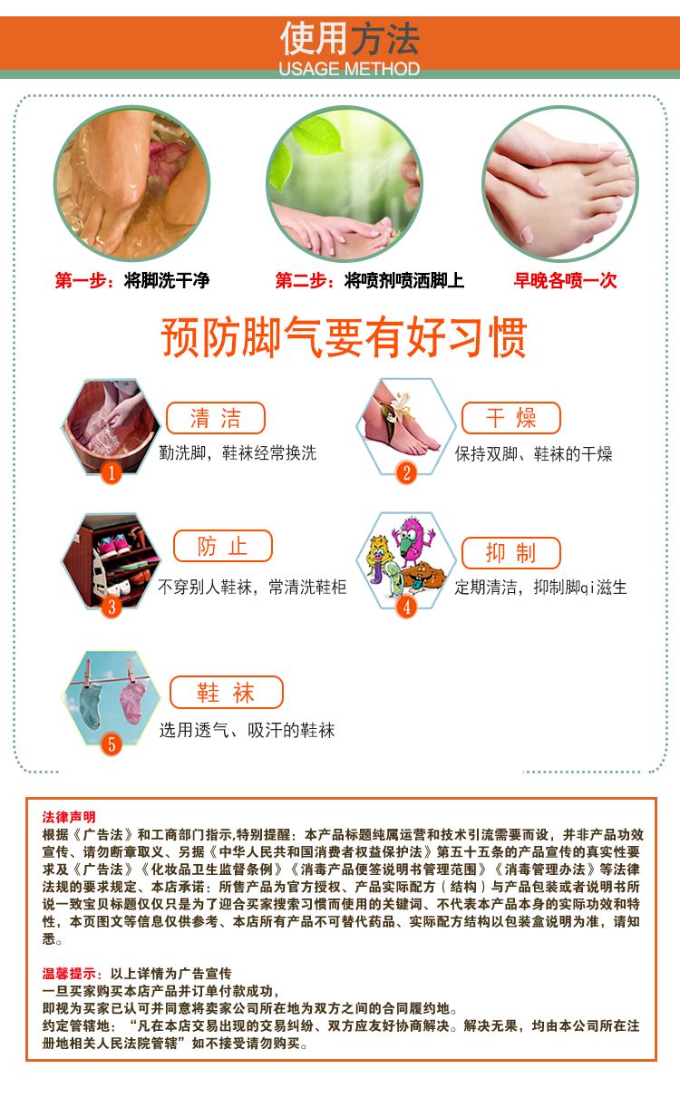 | 使用方法 | 第一步:將腳洗干凈 第二步:將噴劑噴灑腳上 第三步:早晚各噴一次 |