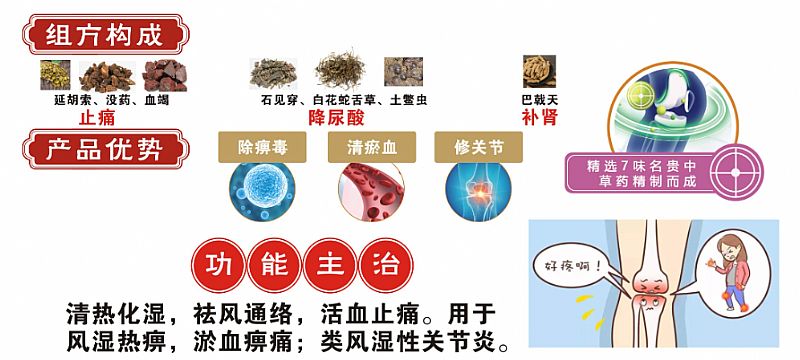 | 功能主治 | 清熱化濕,祛風通絡,活血止痛。用于風濕熱痹,淤血痹痛;類風濕性關(guān)節(jié)炎。 |