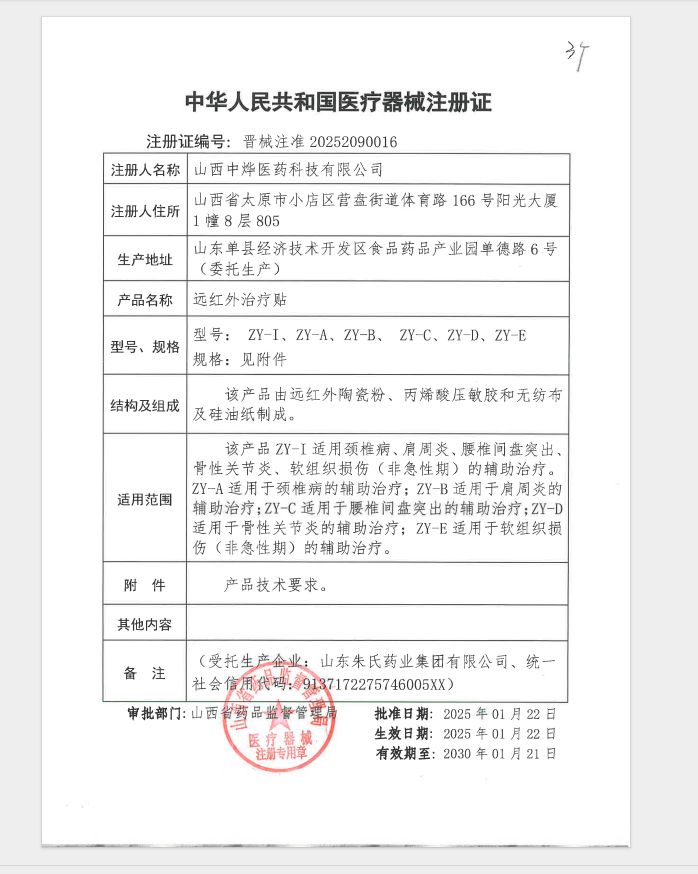 | 產(chǎn)品用途 | ZY-I適用頸椎病、肩周炎、腰椎間盤突出、骨性關(guān)節(jié)炎、軟組織損傷(非急性期)的輔助治療。ZY-A適用于頸椎病的輔助治療;ZY-B適用于肩周炎的輔助治療;ZY-C適用于腰椎間盤突出的輔助治療;ZY-D適用于骨性關(guān)節(jié)炎的輔助治療;ZY-E適用于軟組織損傷(非急性期)的輔助治療。 |