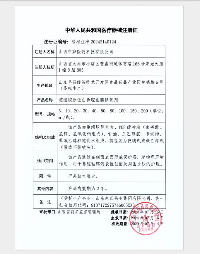 產(chǎn)品名稱: 重組膠原蛋白鼻腔粘膜修復(fù)劑