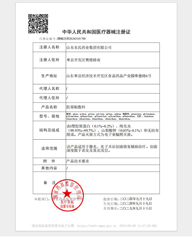 | 主要成分 | 由Ⅰ型膠原蛋白(0.1%~0.2%)、純化水(99.95%~99.7%)、山梨酸鉀(0.05%~0.1%)和無紡布組成。產(chǎn)品滅菌方式為電子束輻照滅菌。 |
