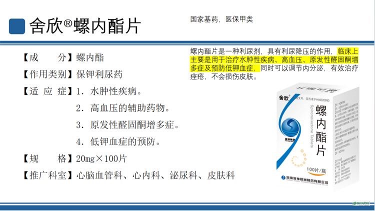 | 適應(yīng)癥 | 1.水腫性疾病與其他利尿藥合用,治療充血性水腫、肝硬化腹水、腎性水腫等水腫性疾病,其目的在于糾正上述疾病時(shí)伴發(fā)的繼發(fā)性醛固酮分泌增多,并對(duì)抗其他利尿藥的排鉀作用。也用于特發(fā)性水腫的治療。 2.高血壓作為治療高血壓的輔助藥物。 3.原發(fā)性醛固酮增多癥***可用于此病的診斷和治療。 4.低鉀血癥的預(yù)防與噻嗪類利尿藥合用,增強(qiáng)利尿效應(yīng)和預(yù)防低鉀血癥。 |