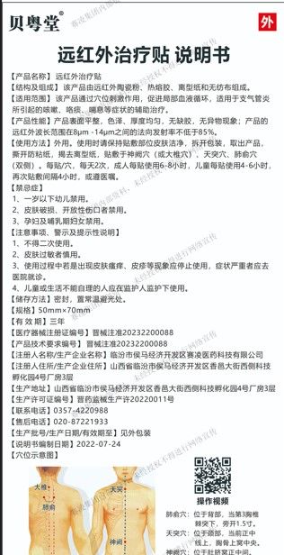 | 產(chǎn)品用途 | 適用范圍:該產(chǎn)品通過穴位刺激作用,促進局部血液循環(huán),適用于支氣管炎所引起的咳嗽,咯痰,喘息等癥狀的輔助治療。 |