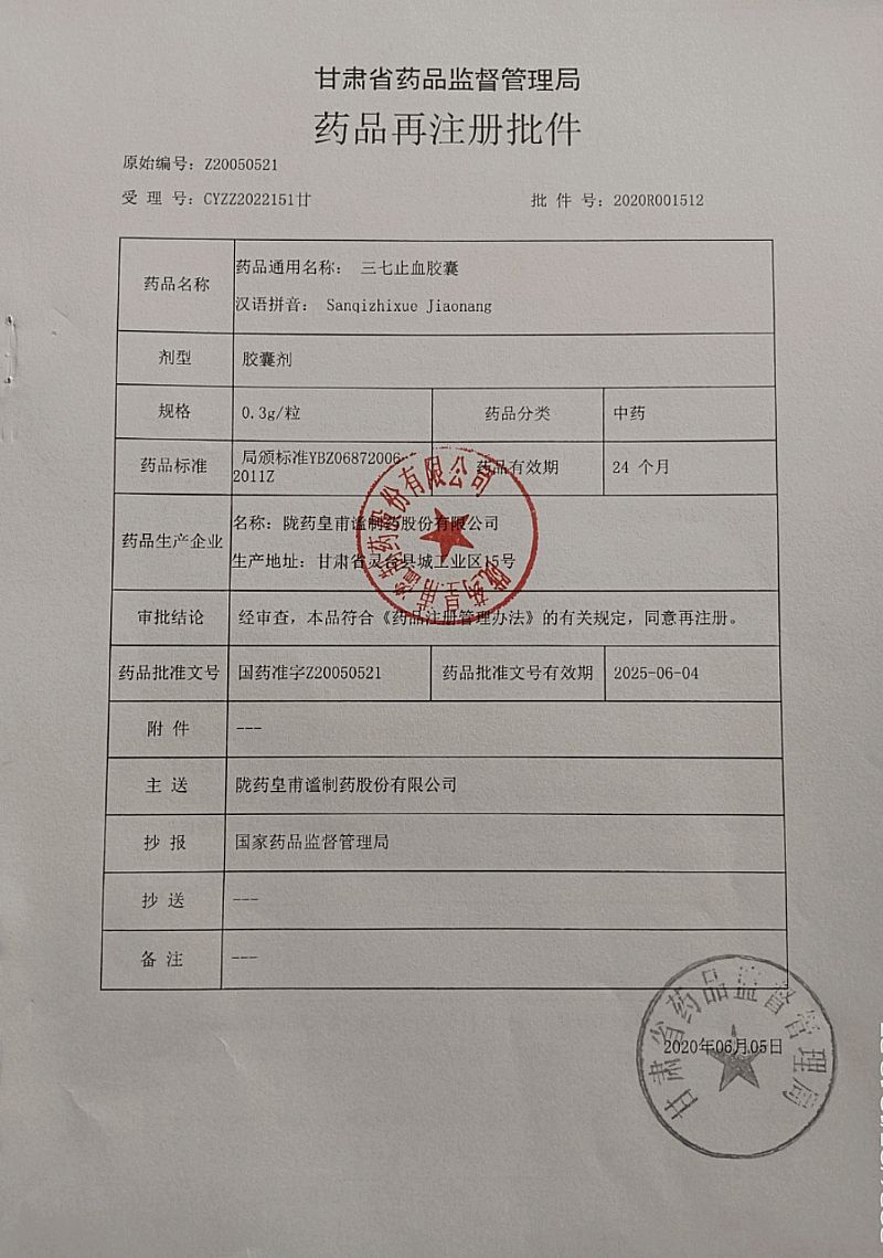 | 補(bǔ)充說(shuō)明 | 四川醫(yī)保目錄 成分:三七、地錦草 功能主治:行瘀止血,消腫,定痛。用于吐血、衄血、血痢血崩,產(chǎn)后流血不止,月經(jīng)過(guò)多及外傷出血 規(guī)格:每粒裝0.3g 用法用量:一次2粒,一日3次;兒童酌減 包裝:12!2板/盒,12!3板/盒 有效期:24個(gè)月 不良反應(yīng):尚不明確 禁忌:尚不明確 注意事項(xiàng):尚不明確 貯藏:密封 包裝:鋁塑泡罩包裝 執(zhí)行標(biāo)準(zhǔn):國(guó)家食品藥品監(jiān)督管理總局國(guó)家藥品標(biāo)準(zhǔn)YBZ06872006-2011Z 藥品上市持有許可人:隴藥皇甫謐制藥(甘肅)有限公司 |