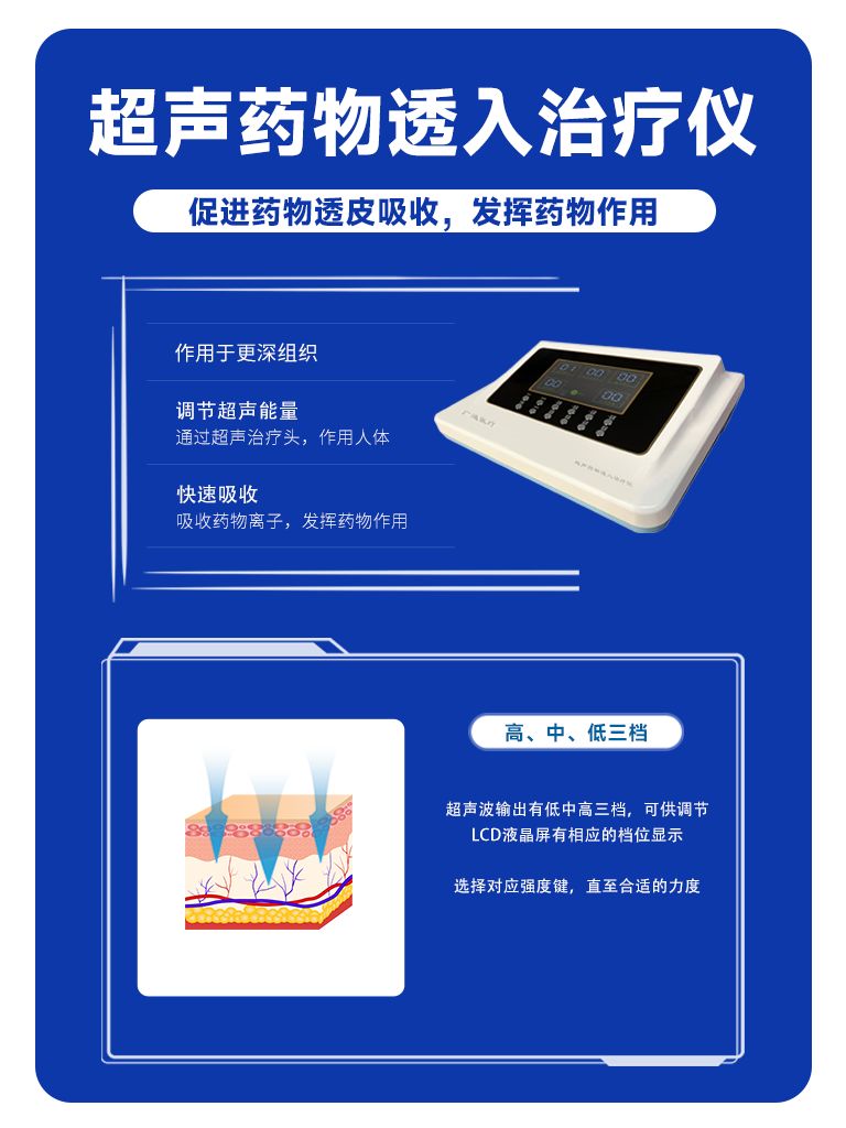 | 補(bǔ)充說(shuō)明 | 導(dǎo)入療法:超聲導(dǎo)入儀是通過(guò)超聲波,電致孔,電導(dǎo)聯(lián)合作用將藥物通過(guò)皮膚這個(gè)特殊的通道進(jìn)入病變組織,發(fā)揮藥物作用,利用配套耗材來(lái)完成藥物經(jīng)肌膚直接到病灶部位,靶位給藥。區(qū)別于口服、肌注、靜脈滴注等給藥方法,屬于第三代的給藥模式。 作用機(jī)理:超聲藥物導(dǎo)入療法是將藥物加入接觸劑中,利用超聲波對(duì)媒質(zhì)的彌散作用和改變細(xì)胞膜的通透性把藥物經(jīng)過(guò)皮膚或黏膜透入機(jī)體的治療方法。 超聲導(dǎo)入儀綜合采用超低頻超聲(20Hz)等物理能量,利用超聲波的聚焦輻射壓產(chǎn)生沖擊力,使機(jī)械能轉(zhuǎn)化為強(qiáng)力動(dòng)能,將藥物發(fā)射透過(guò)皮膚進(jìn)入體內(nèi),達(dá)到無(wú)針射的效果。的來(lái)說(shuō)超聲導(dǎo)入儀是以超聲波為主要?jiǎng)恿?shí)現(xiàn)無(wú)針注射靶位透藥的醫(yī)療設(shè)備 具體可適用于:綜合醫(yī)院、中醫(yī)醫(yī)院、中西醫(yī)結(jié)合醫(yī)院、社區(qū)衛(wèi)生服務(wù)中心、社區(qū)衛(wèi)生服務(wù)站、療養(yǎng)院護(hù)理院、護(hù)理站,美容機(jī)構(gòu)等其他醫(yī)療機(jī)構(gòu)。 |