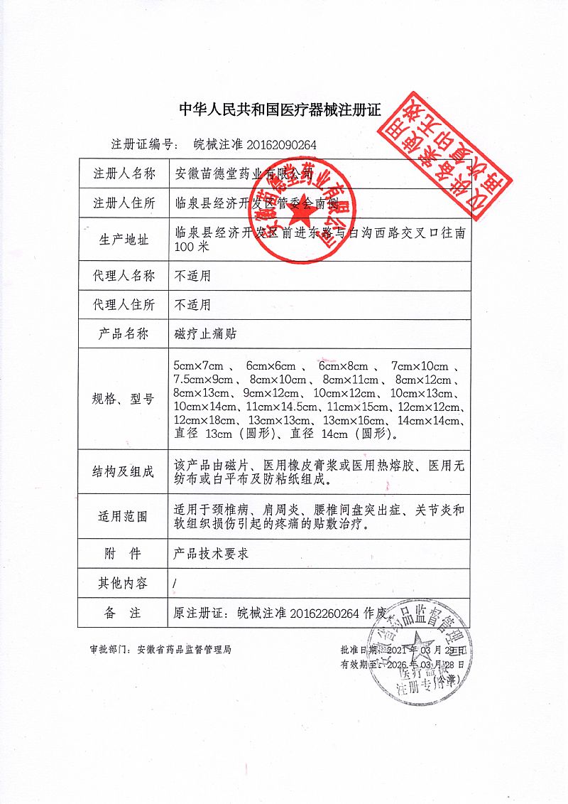 | 主要成分 | 該產(chǎn)品由磁片、醫(yī)用橡皮膏漿或醫(yī)用熱熔膠、醫(yī)用無紡布或白平布及防粘紙組成。 |