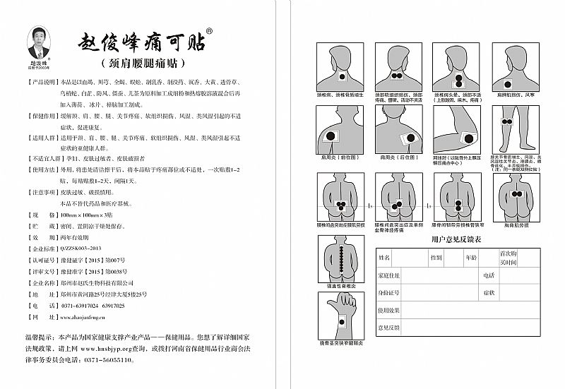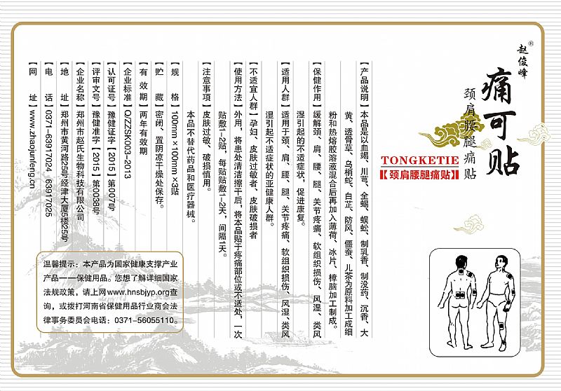 | 補(bǔ)充說(shuō)明 | 【產(chǎn)品說(shuō)明】本品是以血竭、川芎、全蝎、蜈蚣、制乳香、制沒(méi)藥、沉香、大黃、透骨草、烏梢蛇、白芷、防風(fēng)、僵蠶、兒茶為原料加工成細(xì)粉和熱熔膠溶液混合后再加入薄荷、冰片、樟腦加工制成。 【保健作用】緩解頸、肩、腰、腿、關(guān)節(jié)疼痛、軟組織損傷、風(fēng)濕、類(lèi)風(fēng)濕引起的不適癥狀,促進(jìn)康復(fù)。 【適用人群】適用于頸、肩、腰、腿、關(guān)節(jié)疼痛、軟組織損傷、風(fēng)濕、類(lèi)風(fēng)濕引起不適癥狀的亞健康人群。 【不適宜人群】孕婦、皮膚過(guò)敏者、皮膚破損者 【使用方法】外用,將患處清潔擦干后,將本品貼于疼痛部位或不適處,一次貼敷1-2貼,每貼貼敷1-2天,間隔1天。 【注意事項(xiàng)】皮膚過(guò)敏、破損慎用。 本品不替代藥品和醫(yī)療器械。 |