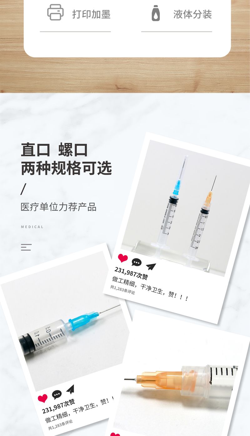 | 使用方法 | .1撕開單包裝袋,取出注射器。2.2去掉注射針保護套,拉動芯桿作來回滑動,擰緊注射針,然后抽入藥液。2.3注射針向上,緩慢上推芯桿排除空氣。2.4進行皮下或肌肉注射或進行抽血 |