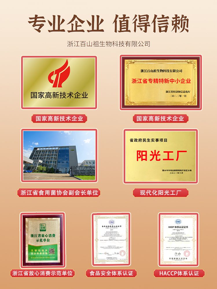 | 補充說明 | 浙江百山祖生物科技有限公司以品質(zhì)為生命,建立了從原料生產(chǎn)到終端產(chǎn)品的全過程質(zhì)量控制體系;以人才為核心,組建了院士領(lǐng)銜的科技委員會;以創(chuàng)新為動力,承擔了國家科技部、發(fā)改委等多項國家級科研項目;以合作為共贏,積極開展技術(shù)合作,先后與多家研究院所簽訂產(chǎn)學研合作協(xié)議;以國際化為重點,以樹立中國菌菇產(chǎn)品高品質(zhì)國際形象為己任,產(chǎn)品定位為國際市場上高品質(zhì)菌菇的標桿,多次參加國際上行業(yè)展會。 好山好水好靈芝 浙江麗水龍泉,山清水秀,環(huán)境優(yōu)美。麗水素有“中國生態(tài)**市”美譽,是香菇之鄉(xiāng)、靈芝道地產(chǎn)地,也是著名的長壽之鄉(xiāng)。公司優(yōu)選優(yōu)質(zhì)靈芝品種,經(jīng)國家菌種保藏中心鑒定的為列入國家藥典的藥用赤靈芝品種,品種經(jīng)不斷選育,性能優(yōu)良 道地椴木種植 公司在浙江龍泉建立有機靈芝基地,采用椴木仿野生栽培。浙江龍泉為中華靈芝之鄉(xiāng),國家認定的靈芝和靈芝孢子粉地理標志產(chǎn)地。 高新技術(shù)破壁 靈芝孢子粉采用應用于航天軍工領(lǐng)域的低溫剪切破壁高新技術(shù),科學控制破壁時間、破壁溫度和破壁率,釋放靈芝孢子的活性成分。 活性成分豐富 公司生產(chǎn)的綠谷明珠牌破壁靈芝孢子粉,**釋放靈芝孢子粉中的多種活性成分,使得靈芝多糖、靈芝三萜、孢子油、不飽和脂肪酸、微量元素、膳食纖維等共同聯(lián)合,發(fā)揮健康保健作用。 多國有機認證 公司是靈芝等食藥用菌功能性菌菇營養(yǎng)食品領(lǐng)域的國家高新技術(shù)企業(yè)。生產(chǎn)的破壁靈芝孢子粉主要出口海外。產(chǎn)品獲得了中國、美國、歐盟、英國、加拿大、日本等國家的有機認證和猶太潔食認證。 口感細膩清香 采用先進的破壁和充氮包裝技術(shù),產(chǎn)品細度>300目,保持了靈芝孢子粉的天然風味,細膩菌香,含在口中具有巧克力的絲滑和香味。 功效臨床驗證 “綠谷明珠”和“百山祖”是公司自有品牌。公司在中國上市的綠谷明珠牌和百山祖牌破壁靈芝孢子粉,經(jīng)三家三甲醫(yī)院人體試驗驗證,能**增強人體免疫力。 行業(yè)標準制定 公司是靈芝破壁孢子粉國家行業(yè)標準牽頭制定單位。生產(chǎn)的破壁靈芝孢子粉,是不添加任何輔料的純凈靈芝孢子粉,營養(yǎng)成分全,活性成分高,顧客復購率高。 獲得多項榮譽 產(chǎn)品自2015年上市以來,獲得“*受歡迎的免疫類產(chǎn)品”、“十佳靈芝孢子粉品牌”、“2023年浙江特色伴手禮”、“麗水特色伴手禮”等榮譽。 國內(nèi)國外同質(zhì) 公司生產(chǎn)的食用菌產(chǎn)品出口美國、英國、澳大利亞等多個國家和地區(qū),深受歡迎。綠谷明珠牌破壁靈芝孢子粉國內(nèi)外有不同包裝規(guī)格,但產(chǎn)品品質(zhì)和標準完全相同。在國內(nèi)連鎖藥房和各大電商平臺均有銷售。 |