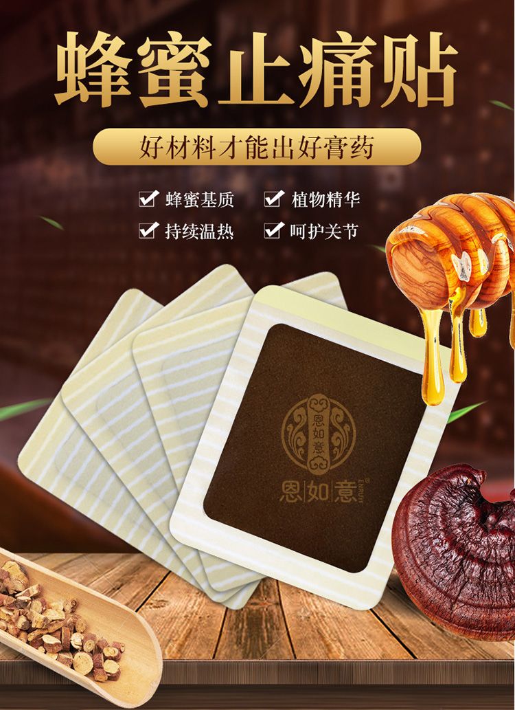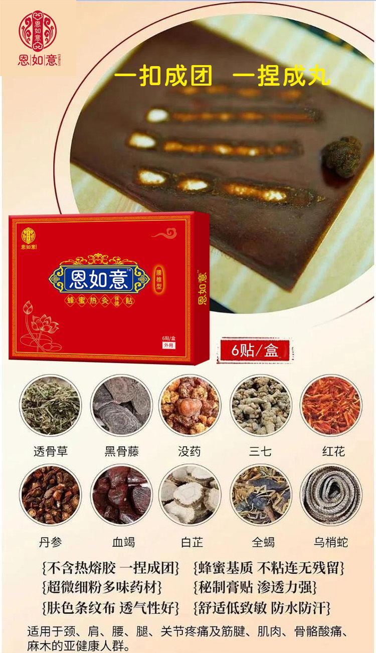 | 補(bǔ)充說明 | 恩如意蜂蜜熱灸貼的九大優(yōu)勢(shì): 一、正宗苗方苗藥,百年配方,經(jīng)典驗(yàn)方,秘制而成; 二、不含熱熔膠,一扣成團(tuán),一捏成丸,不易過敏,溫和不刺癢; 三、專方專用、配伍獨(dú)特、大尺寸、含藥量大、藥力足、效果快,一貼可以貼3-5天,持續(xù)時(shí)間更長(zhǎng); 四、以蜂蜜為基質(zhì),載藥量大,高達(dá)60%以上,效果更強(qiáng)大,而且保濕性強(qiáng),與皮膚相容性好,能促進(jìn)藥物對(duì)肌膚的滲透,有效成分吸收更充分,效果更明顯; 八、精選醫(yī)用新材料(油膠水刺布),透氣強(qiáng),不易過敏,不刺癢,夏天也不易脫落; 九、貴州海拔2493米的梵凈山深處采摘的名貴中藥材,無污染,無公害,效力更強(qiáng),用著更放心,更舒心; |