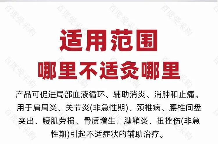 | 產(chǎn)品用途 | 【該產(chǎn)品可促進(jìn)局部血液循環(huán)、輔助消炎、消腫和止痛。適用于緩解肩周炎、關(guān)節(jié)炎、腱鞘炎、痛風(fēng)性關(guān)節(jié)炎、扭挫傷(非急性期)引起不適癥狀的輔助治療 |