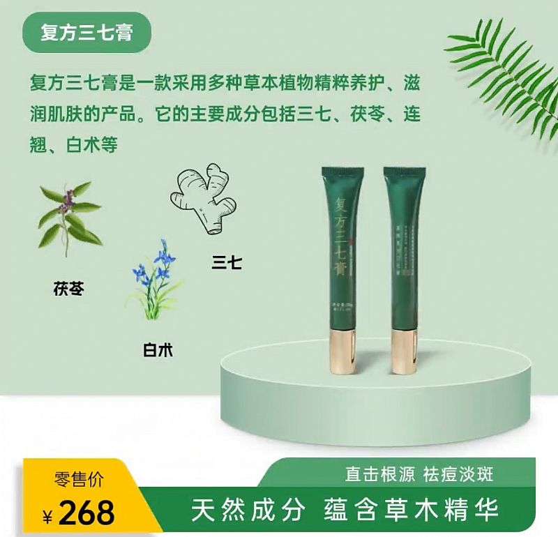 | 產(chǎn)品賣點 | 復(fù)方三七膏,讓你的肌膚煥發(fā)光彩 你是否渴望擁有細(xì)膩柔潤、煥發(fā)活力與光彩的肌膚?你是否在尋找一種有效的護(hù)膚產(chǎn)品?如果是的話,那么你一定不能錯過復(fù)方三七膏! |