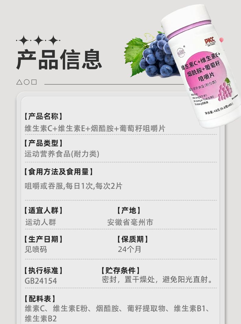 | 主要成分 | 維生素c+維生素e+煙酰胺+葡萄籽咀嚼片 |
