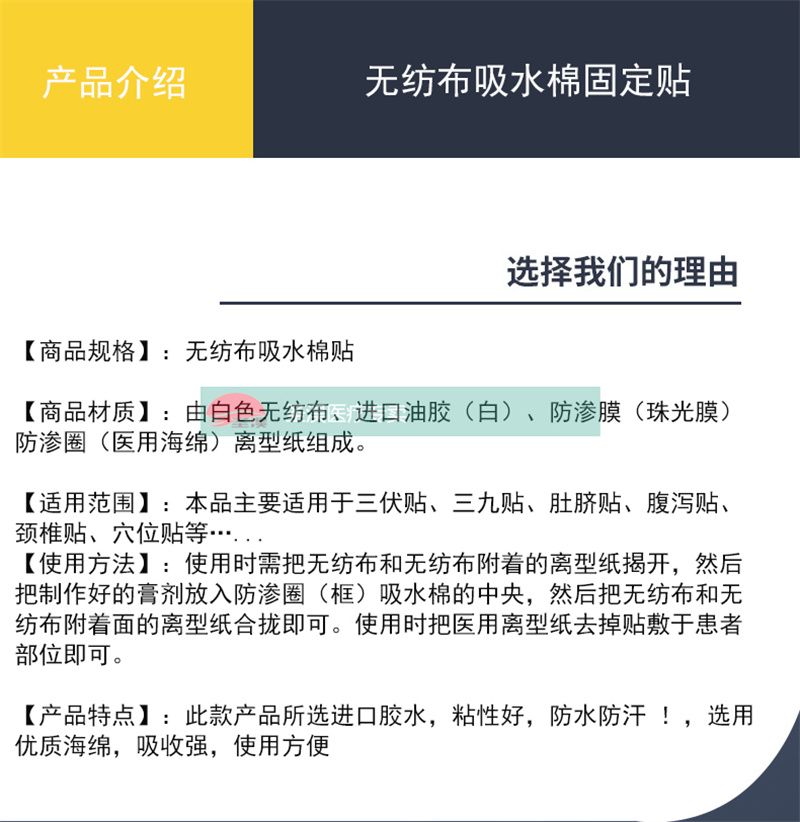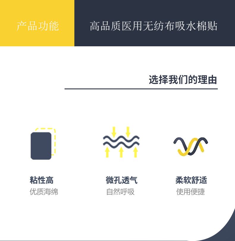 | 產(chǎn)品賣點(diǎn) | 透氣膠貼,醫(yī)用級(jí)別涂膠層,加入吸水棉,可將液體型藥劑放置于吸水棉上,助力藥劑穩(wěn)定、持續(xù)的發(fā)揮藥力。 |