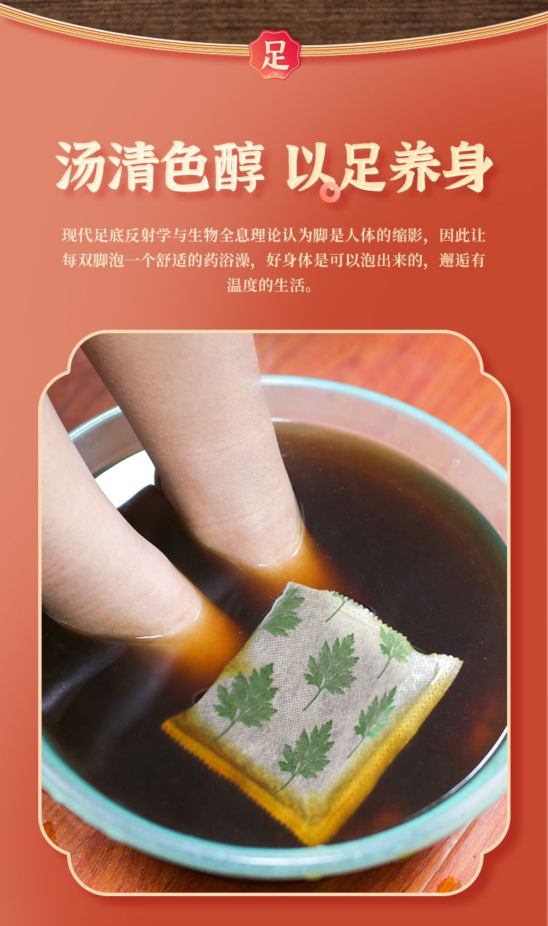| 使用方法 | 將足浴包放入盆中;加入沸水浸泡3-5分鐘;加入溫水調(diào)至適宜水溫;泡腳20-30分鐘至微微出汗。 |