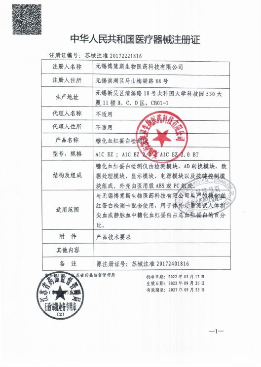 | 補(bǔ)充說明 | 與無錫博慧斯生物醫(yī)藥科技有限公司生產(chǎn)的糖化血紅蛋白檢測卡配套使用 |