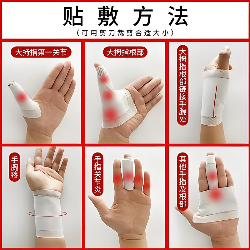 | 使用方法 | 清潔疼痛部位皮膚,擦干后揭開貼劑保護(hù)膜; 對準(zhǔn)疼痛中心(如手腕橈骨莖突、手指關(guān)節(jié)處)貼敷,輕輕按壓使膏體與皮膚緊密貼合; 每貼建議貼敷8-12小時(shí),每日1次,急性疼痛期可每日2次(間隔4小時(shí)),20天為一療程; 揭下時(shí)緩慢輕柔,避免拉扯皮膚,敏感肌膚可縮短貼敷時(shí)間或間隔使用。 |