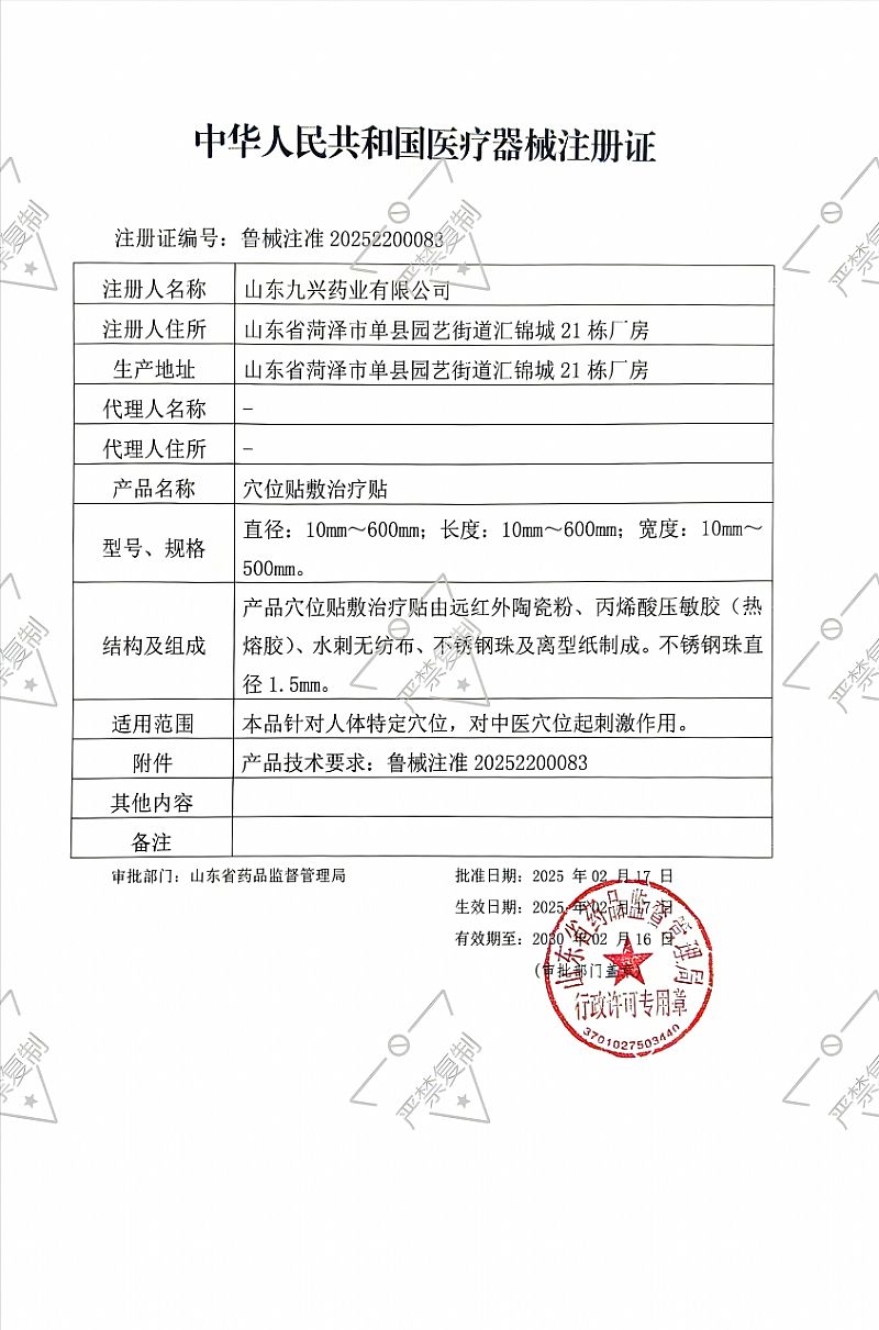 | 其它說明 | 山東九興藥業(yè)有限公司專注經(jīng)營各類膏藥代加工、黑膏藥貼牌加工、老黑膏代加工、遠(yuǎn)紅外理療貼代加工、穴位貼敷治療貼代加工、冷敷貼代加工、熱敷貼代加工、小兒貼代加工、導(dǎo)光凝膠代加工、艾灸液代加工、退熱貼代加工、三伏貼代加工、穴位貼代加工、眼貼代加工、耳貼代加工、鼻貼代加工、前列腺貼代加工、失眠貼代加工、戒煙貼代加工、艾灸液代加工、泡浴包代加工、腳氣水代加工、草本精油代加工、活絡(luò)油代加工、推拿油代加工等,專注于骨科、婦科、耳鼻喉科、兒科等貼膏的研發(fā)生產(chǎn)代加工。 公司擁有業(yè)內(nèi)先進(jìn)的生產(chǎn)技術(shù)、規(guī)范的質(zhì)量服務(wù)體系和企業(yè)管理。山東九興藥業(yè)有限公司作為膏藥貼牌代工廠,承接**規(guī)格型號、材質(zhì)、尺寸的膏藥OEM/ODM貼牌定制代加工。 |