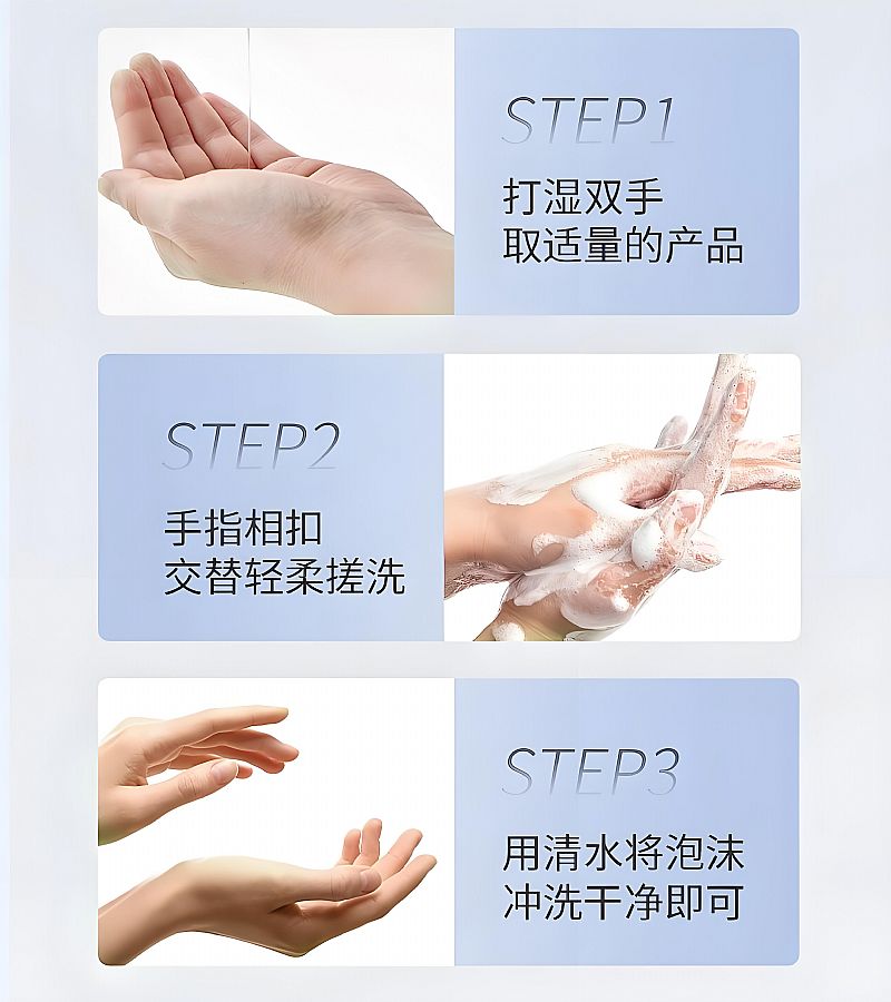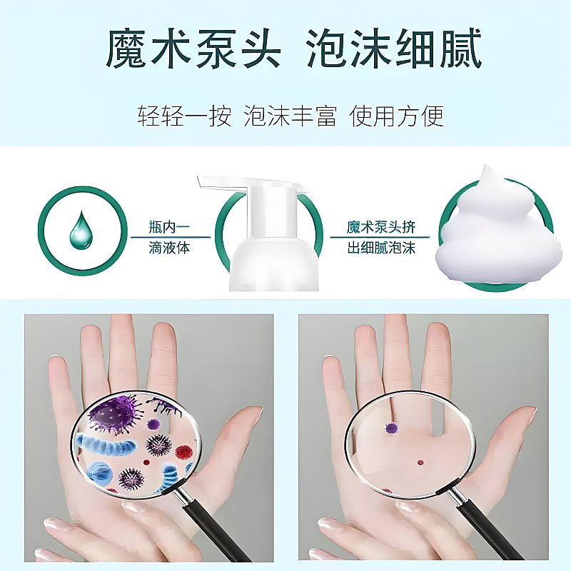 | 使用方法 | 1.先將雙手用清水充分濕潤。 2.輕壓泵頭,擠出適量洗手液于掌心,一般2-3泵即可滿足雙手清潔需求。 3.雙手相互揉搓,確保洗手液均勻覆蓋雙手各個部位,包括掌心、手背、手指縫、指甲等,揉搓時間不少于20秒,可有效清潔并發(fā)揮抗菌作用。 4.用流動的清水徹底沖洗雙手,直至洗手液殘留被完全沖凈。 5.用干凈的毛巾或紙巾輕輕擦干雙手,避免用力擦拭損傷皮膚。 |