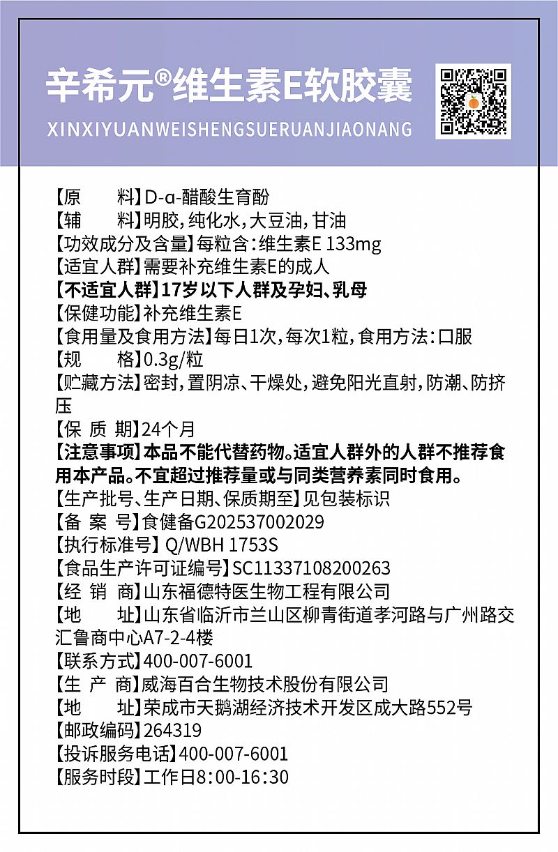 | 補(bǔ)充說明 | [適宜人群]需要補(bǔ)充維生素E的成人 [不適宜人群]17歲以下人群及孕婦、乳母 [貯藏方法]密封,置陰涼、干燥處,避免陽光直射,防潮、防擠壓 [保健功能]補(bǔ)充維生素E [保質(zhì)期]24個月 [注意事項(xiàng)]本品不能代替藥物。適宜人群外的人群不推薦食用本產(chǎn)品。不宜超過推薦量或與同類營養(yǎng)素同時食用。 [生產(chǎn)批號、生產(chǎn)日期、保質(zhì)期至]見包裝標(biāo)識 |