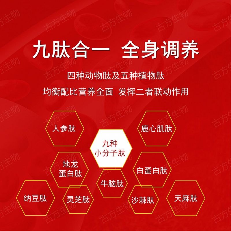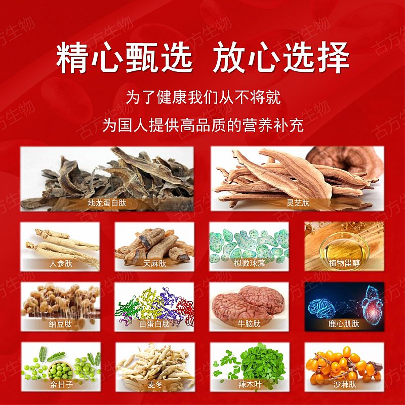 | 主要成分 | 鹿心肌肽、牛腦肽、白蛋白肽、納豆肽、天麻肽、植物甾醇、地龍蛋白肽、人參肽、沙棘肽、余甘子、麥冬、靈芝肽、擬微球藻、辣木葉等。 |