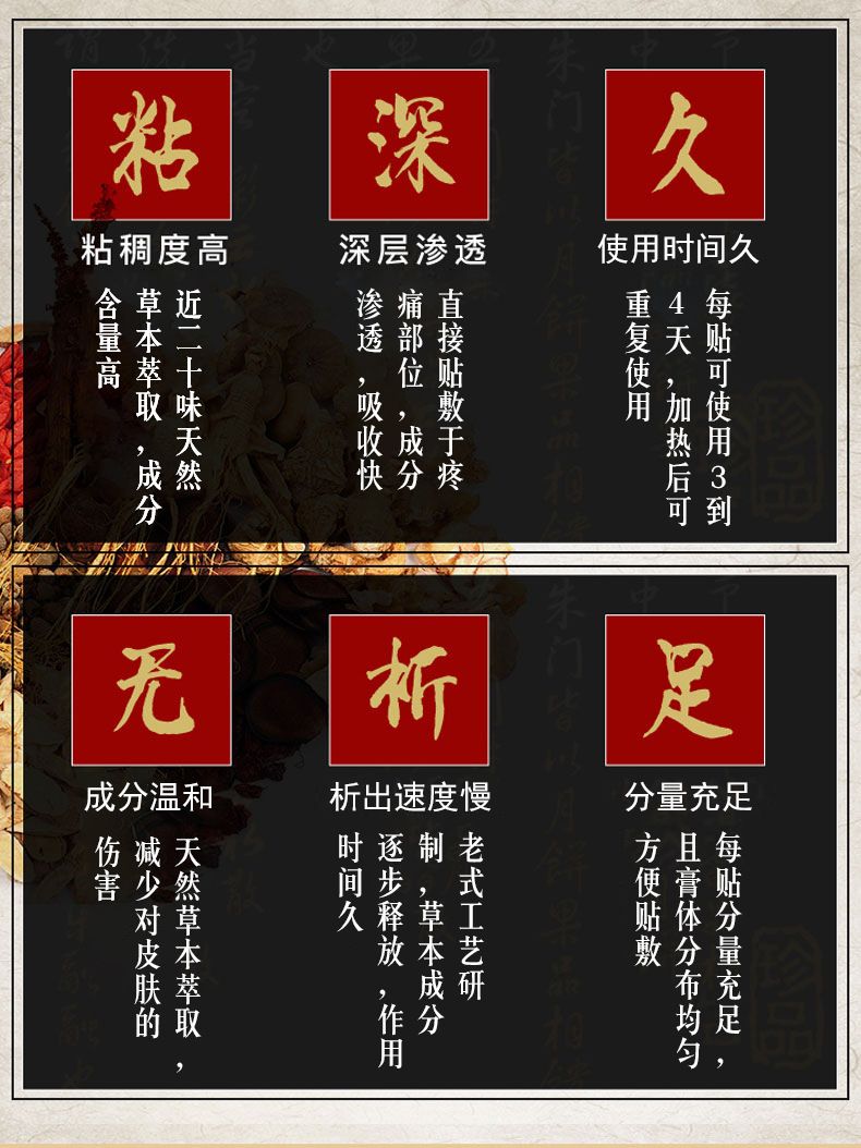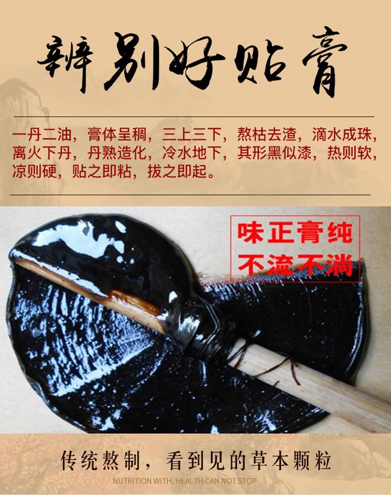 | 主要成分 | 黑膏藥是由各類草本植物提取物配比煉制而成的外用膏劑,經古法熬制而成。 |
