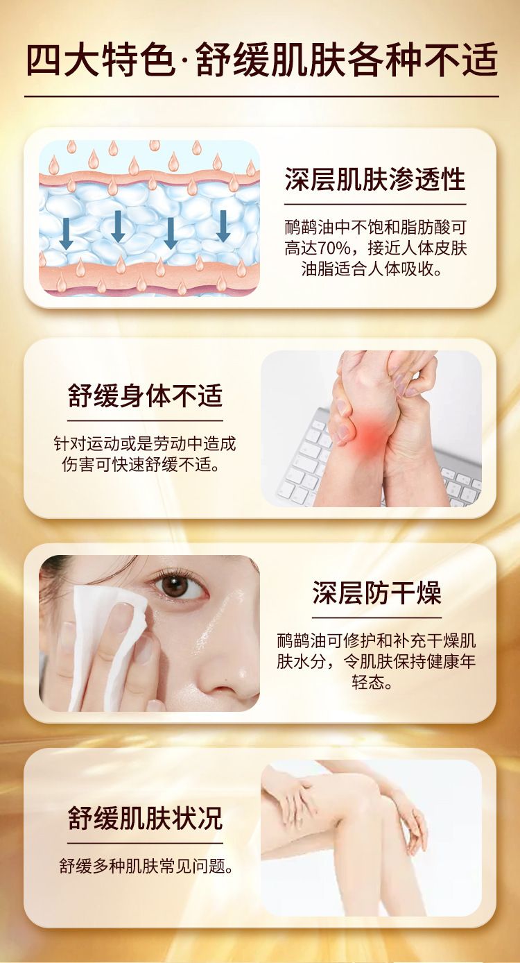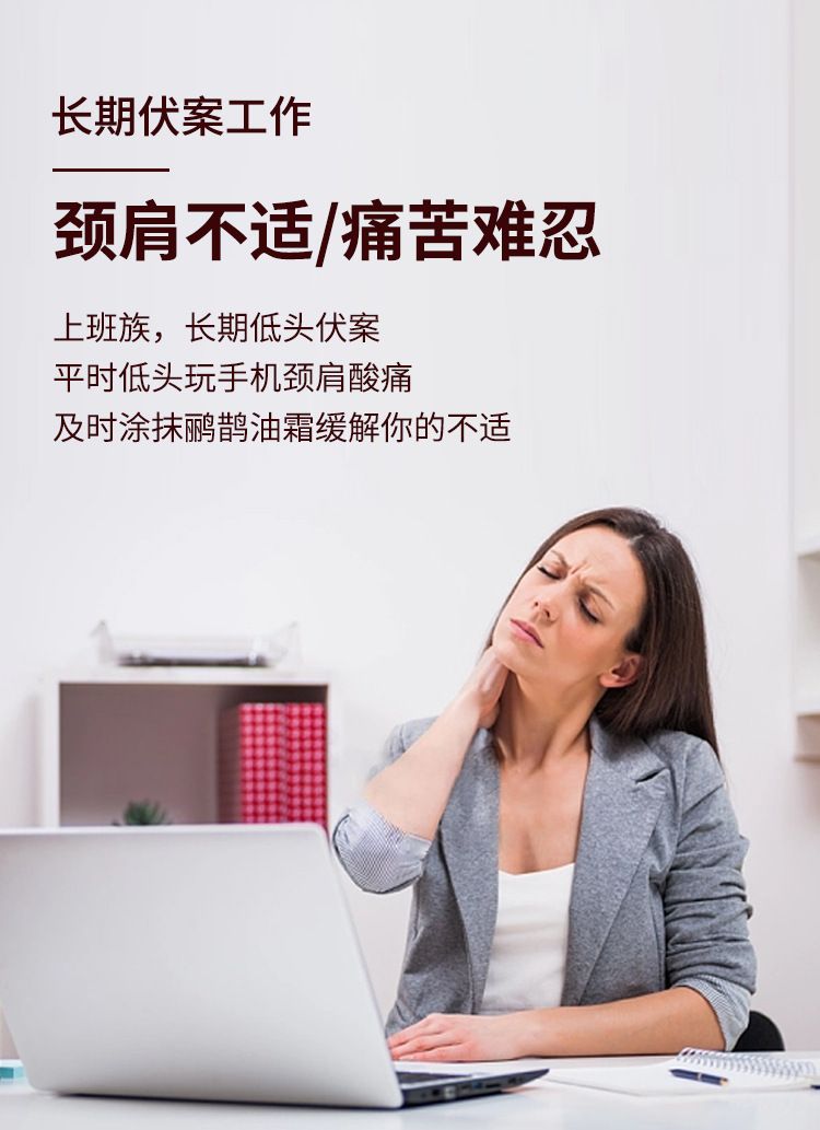 | 產(chǎn)品用途 | 鴯鹋油通過滲透吸收浸透肌膚,緩解頸肩腰腿疼痛等不適癥狀。 |
