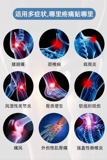 | 產(chǎn)品用途 | 促進(jìn)局部血液循環(huán),輔助消炎,消腫和止痛。一型適用于肩周炎,關(guān)節(jié)炎,頸椎病,腰椎間盤突出,腰肌勞損,足跟痛,骨關(guān)節(jié)炎,膝骨關(guān)節(jié)炎,骨質(zhì)增生,腱鞘炎,跌打損傷,扭挫傷引起的疼痛的輔助治療。 |