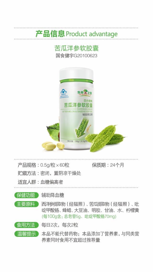 | 產(chǎn)品名稱 | 生命之寶-苦瓜西洋參鉻軟膠囊 |